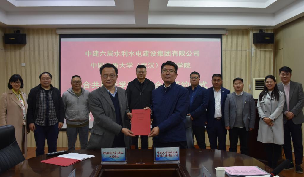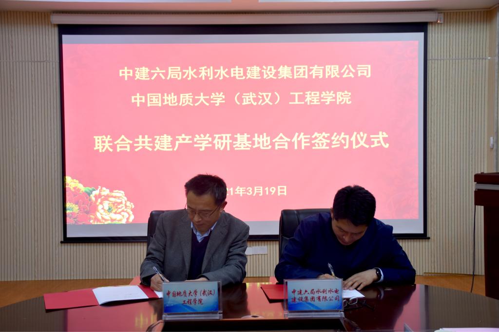 (通讯员:张美霞 文新)3月19日下午,我校1995级73951班校友、中建六局水利水电建设集团有限公司党委书记、董事长魏新颜,带领水利水电公司华北分公司、华南分公司、华中分公司、公司人力资源部负责人一行回到母校,在工程楼315就联合共建产学研基地进行了座谈并举行了签约仪式。中国地质大学(武汉)校友工作与教育基金管理处处长徐岩、工程学院院长焦玉勇、校社会合作办副主任袁江、科长张祎,工程学院陈建平教授、吴立教授等教师代表出席签约仪式。座谈会及签约仪式由工程学院院长焦玉勇主持。