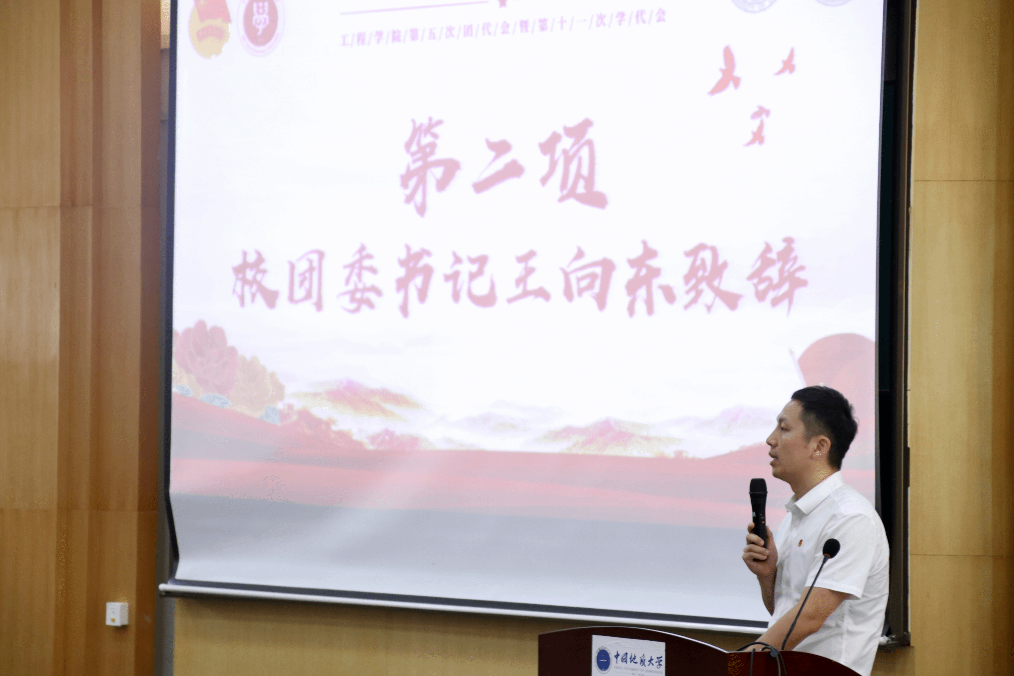 开幕仪式上,校团委书记王向东致辞。他肯定了近年我院在青年思想政治引领、创新创业实践、青年志愿服务、宣传思想文化、基层组织建设等方面取得的成绩。他强调,本次大会是工程学院全体团员青年在校政治生活中的一件大事,更是工程学院共青团围绕学院党委中心任务,团结带领广大青年听党话、跟党走的生动体现。他鼓励青年学生把爱国之情、报国之志融入祖国改革发展的伟大事业之中、融入人民创造历史的伟大奋斗之中,以挺膺之姿筑强国之梦,为建成地球科学领域世界一流大学矢志不移贡献青春力量。