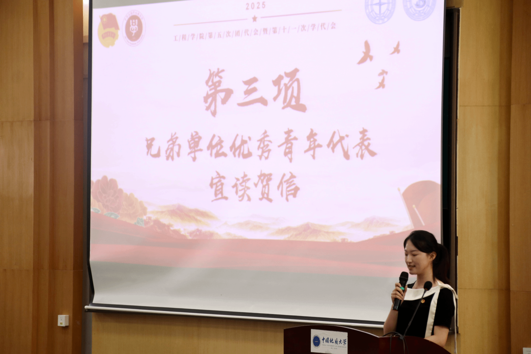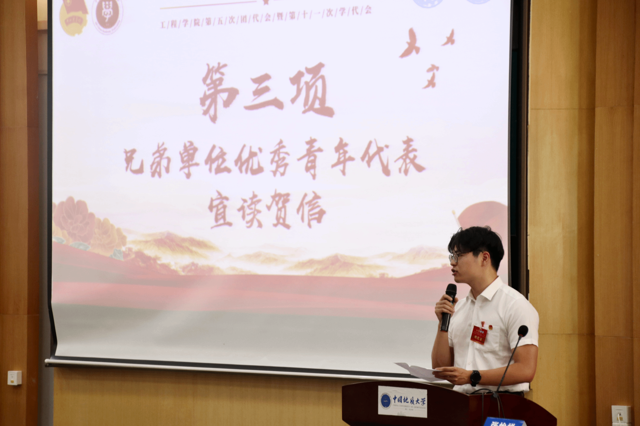 兄弟单位优秀青年代表华中农业大学工学院专职团干贾彦平和2024年全国“青马工程”班委、华中科技大学马克思主义学院硕士研究生张扬分别宣读贺信,贺信中饱含着兄弟院校对工程学院的美好祝愿与深厚情谊,彰显了青年一代团结奋进、携手共进的精神风貌。本次大会还收到了华中科技大学土木与水利工程学院、武汉理工大学土木工程与建筑学院等兄弟高校团委,以及中建三局基建投、武汉地铁集团和中交四航院研究院等企业团组织的贺信。