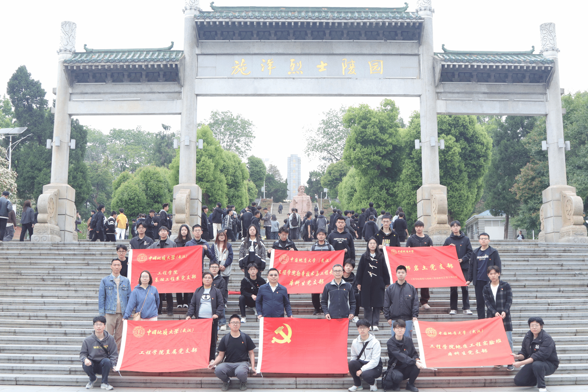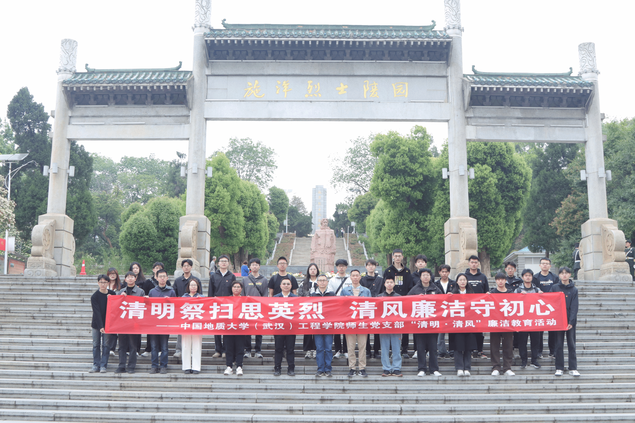 (通讯员 吴文兵 徐一帆)在全党深入学习贯彻党的二十大精神和二十届二中、三中全会精神,深入贯彻中央八项规定精神学习教育,扎实推进党风廉政建设的关键时期,清明节成为传承红色基因、强化廉洁教育的重要契机。2025年4月4日,工程学院组织师生党支部前往施洋烈士纪念馆,开展“清明祭扫思英烈 清风廉洁守初心”主题教育活动。此次活动由工程学院副院长窦斌带队,工程学院勘察与基础工程系党支部、工程学院院直属党支部、勘察与基础工程系研究生第七党支部、地质工程实验班本科生党支部和勘查技术与工程专业本科生党支部的师生党员共同参与。