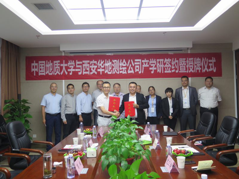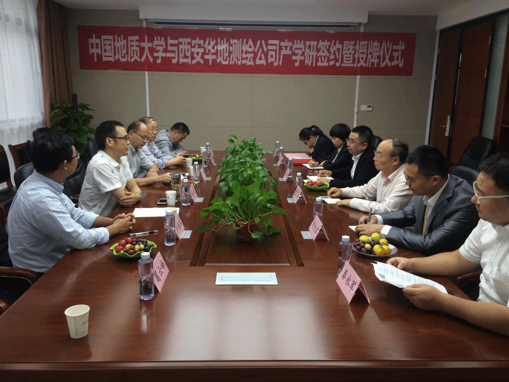 在西安华地测绘科技有限公司,总经理鲁尚强、首席专家亢三焕、营销部经理刘铁岩、财务部经理宋娇艳、人力资源经理秦永军、行政经理任飞霞参与了座谈。座谈会上,总经理鲁尚强代表西安华地测绘科技有限公司致欢迎辞,并介绍了公司的发展概况。窦斌介绍了学校、学院的发展历程,期望双方今后将产学研工作落到实处,预祝取得丰硕成果。中国地质大学(武汉)与会人员,还针对地质灾害评价、地学大数据空间信息获取、地质勘探数据通信传输等领域的技术问题,为公司出谋划策,展开了深入交流。窦斌副院长与鲁尚强总经理分别代表中国地质大学(武汉)与西安华地测绘科技有限公司,在产学研合作协议上签字。根据协议,双方将发挥各自优势,围绕工程地质勘察行业改革发展,实现信息资源共享、优势互补,在人才培养、学科建设及科研成果转化等方面开展合作。会后,江广长副书记与鲁尚强总经理进行了揭牌仪式。