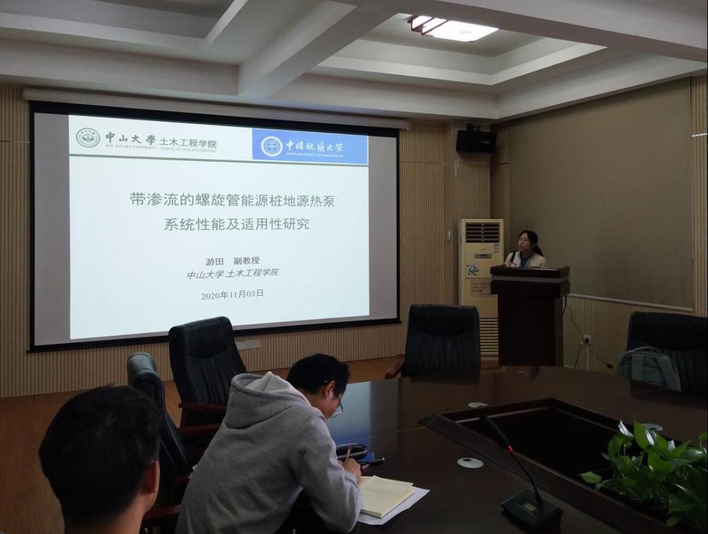 游田副教授详细介绍了区别于地埋管的能源桩三维传热模型,从桩群模型、热泵机组模型、水泵模型和建筑模型四个角度展开介绍,并采用自主研发的软件“能源桩之星”(EP-Star)分析了地下渗流、桩群结构等因素作用下螺旋管能源桩的动态传热机理,对带渗流的螺旋管能源桩地源热泵系统在北方典型气候区(沈阳、长春等)的适用性进行评价。游田副教授讲授深入浅出,对我院师生的踊跃提问给予了悉心解答,在座师生受益匪浅。