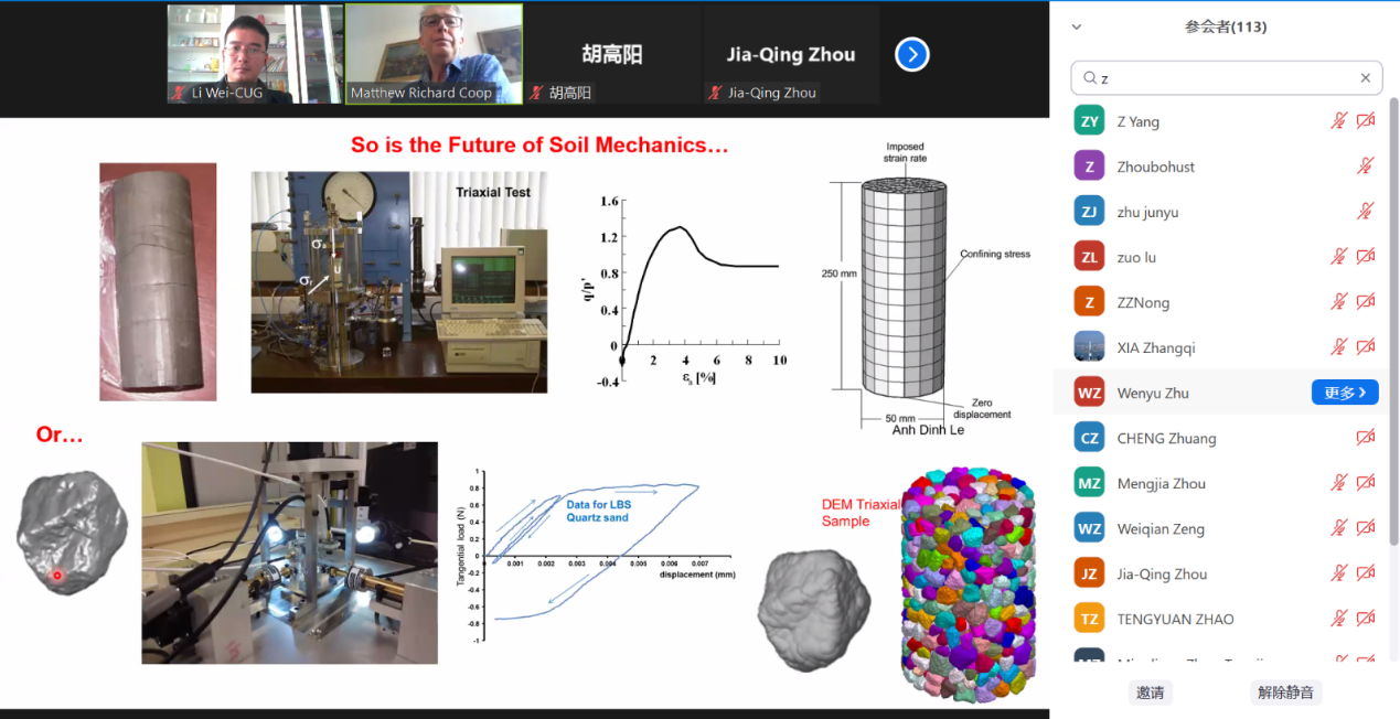 (通讯员 黎伟)2022年7月21日下午,应中国地质大学(武汉)唐辉明教授和黎伟副教授邀请,伦敦大学学院Matthew Coop教授应邀作客2022年第13期“重大地质灾害预测与防控学科”111创新引智基地系列学术讲座。讲座采用Zoom在线会议形式进行,由黎伟特任副教授主持,周佳庆特任教授、叶阳特任教授、张雅慧特任教授、付茹副教授等以及香港大学、香港城市大学、华中科技大学、浙江大学、中南大学、东南大学、合肥工业大学、西安交通大学、中国科学院武汉岩土力学研究所等多个单位120余名师生在线聆听了此次报告。