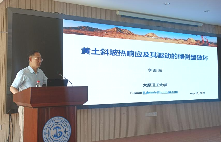 李彦荣教授作了题为“黄土斜坡热响应及其驱动的倾倒型破坏”的学术报告。他首先介绍了全球黄土地层与黄土地貌情况。我国黄土覆盖全国陆地面积约7%,孕育着近2亿人口,是我国农业、工业、畜牧业的核心地带。然而黄土多孔疏松、弱胶结、竖向节理发育,黄土区沟壑纵横、地形破碎、地质环境脆弱,加之黄土高原多见短时强降雨,一方面导致水土流失严重,另一方面致使地质灾害频发,严重影响着人民的生命财产安全和人地协调发展。基于此,李彦荣教授从黄土斜坡温度响应、黄土斜坡的倾倒破坏和温度响应的物质基础三方面分享了自己的研究方向和最新研究成果。