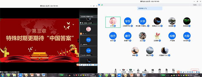2020年5月28日下午2点30分,地下空间工程系党支部通过“腾讯会议”软件在网络上进行了主题为《聚焦全国两会,凝聚决战决胜的中国信心》的支部党日活动,支部全体党员同志参会。地工系党支部书记谭飞同志主持了本次主题党日活动。全体与会党员唱国歌,并重温了入党誓词。随后,由闫雪峰同志带领大家开展了本次主题学习。